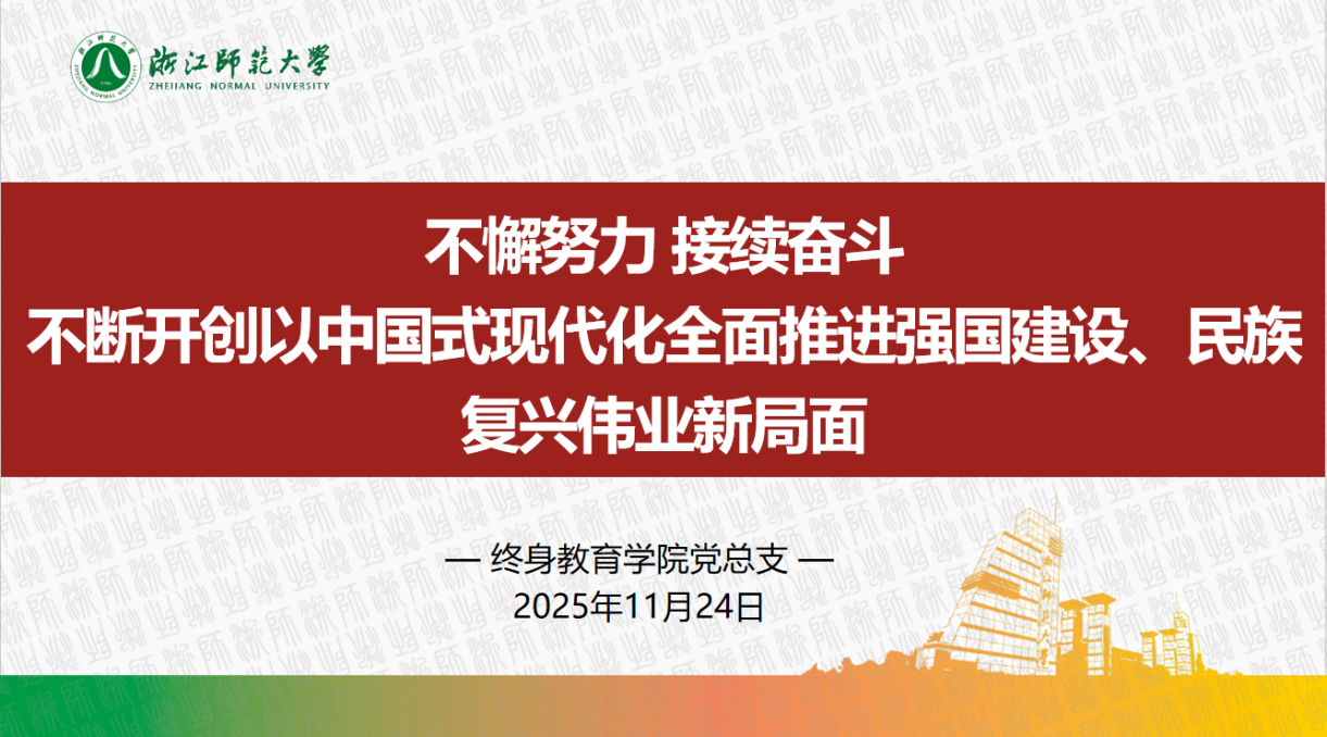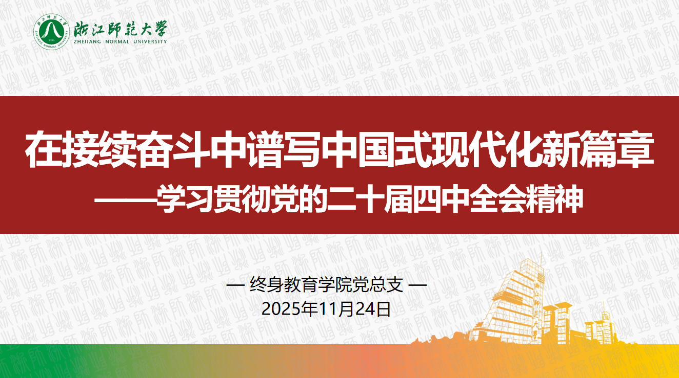 11月24日上午,终身教育学院召开党总支会议,专题学习党的二十届四中全会精神。党总支副书记、院长金祖庆作《在接续奋斗中谱写中国式现代化新篇章》专题辅导报告,党总支书记祝伟华主持会议并领学省委十五届八次全会精神。
